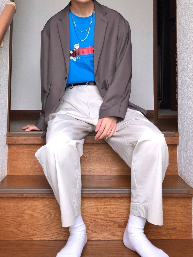ブルーが目を引くユニクロのロゴTをアクセントに、ジャケットとワイドパンツを合わせたコーデ。ブラウンと白の落ち着いた色味との組み合わせにブルーが映えるメリハリスタイルです。