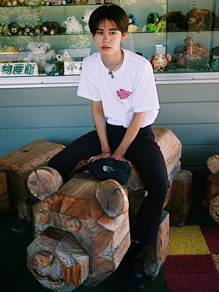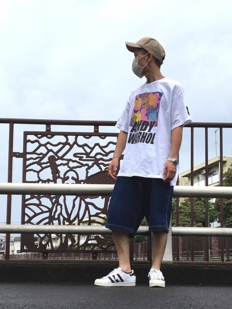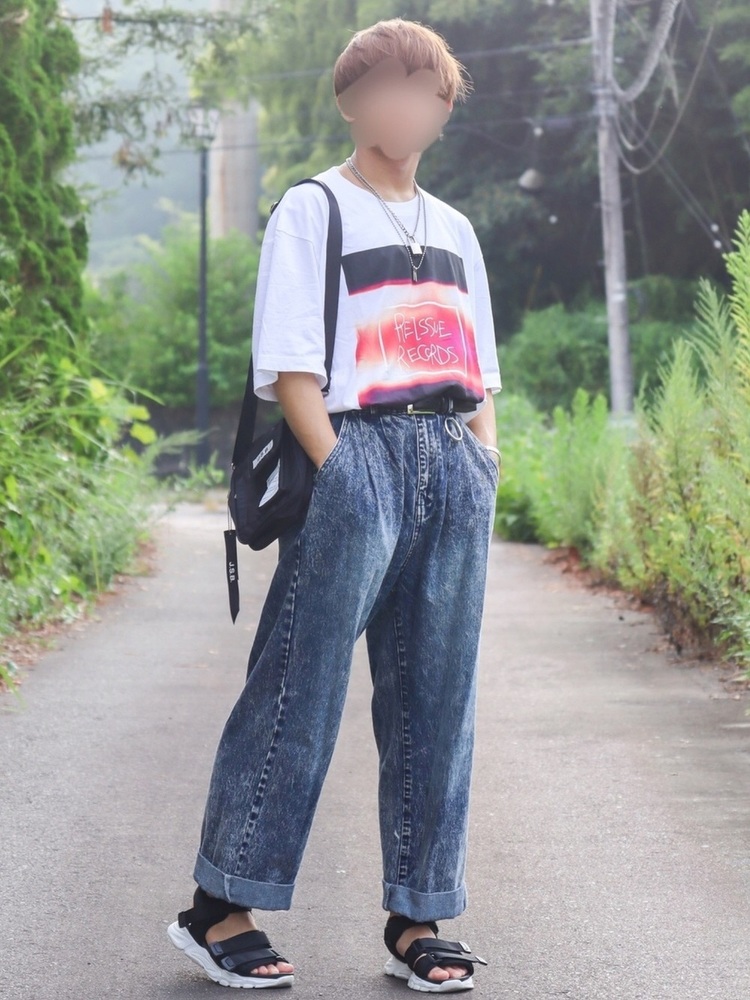 最後はおしゃれなプリントの米津玄師コラボグラフィックTにヴィンテージメイクのデニムを合わせたコーデ。相性が良い定番の白シャツ×デニムの組み合わせでありながら、ワイドなデニムをチョイスし、Tシャツをタックインすることでこなれ感を演出しています。