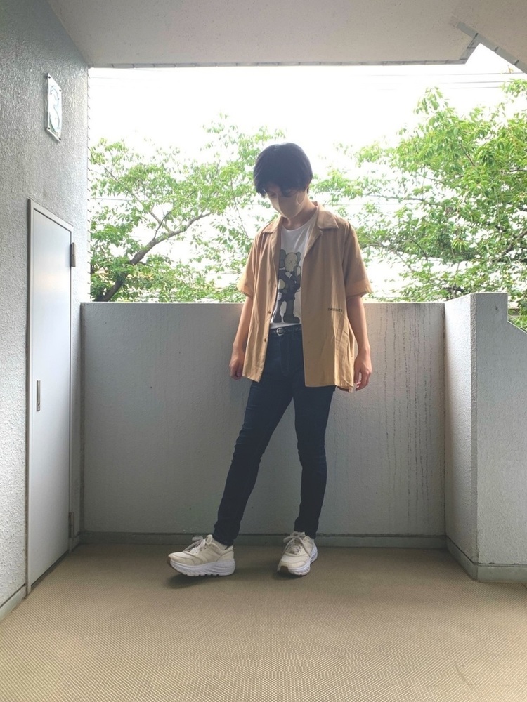 話題にもなったカウズコラボのユニクログラフィックTに、タイトなスキニーとトレンドカラーのシャツを合わせたコーデ。Tシャツはタックインして着て、羽織ったシャツの丈との違いを出すことで野暮ったくならず今風の雰囲気に仕上がります。