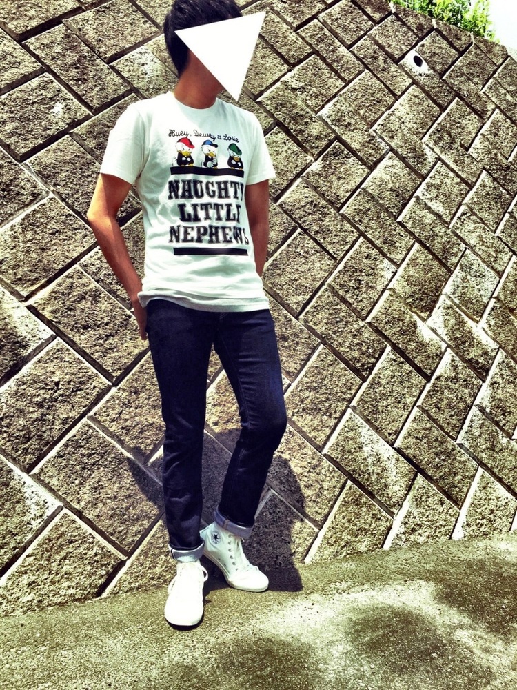 こちらのコーデで使用しているグラフィックTシャツは、ディズニーとのコラボアイテム。ディープカラーのジーンズは、コーデを引き締めてくれる効果があるので、可愛らしいプリントのTシャツを合わせることでバランスの良いコーデになります。