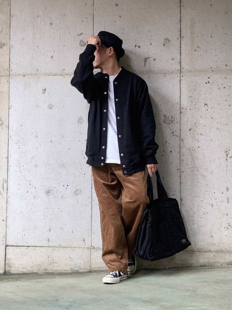 オーバーサイズTシャツにコーディロイワークパンツとカーディガンを合わせた装いは、まさに大人の落ち着いたメンズコーデ。しっかりした生地のTシャツをチョイスしているので、全体がゆるくなりすぎることもなく上質な雰囲気を醸し出しています。