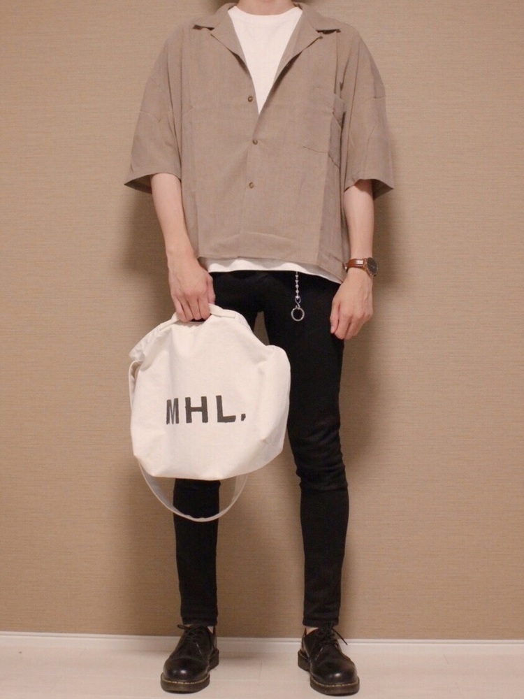 黒のオーバーサイズTシャツにシャツを羽織り、コーデ全体をブラックでまとめたワントーンコーデ。同じ色だからこそ、それぞれの生地感の違いなどでコーデにメリハリが出ます。