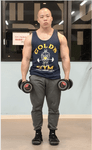 後ろから見ると、この画像のようになります。肩甲骨を寄せるようにダンベルを上げているのがよくわかりますね。