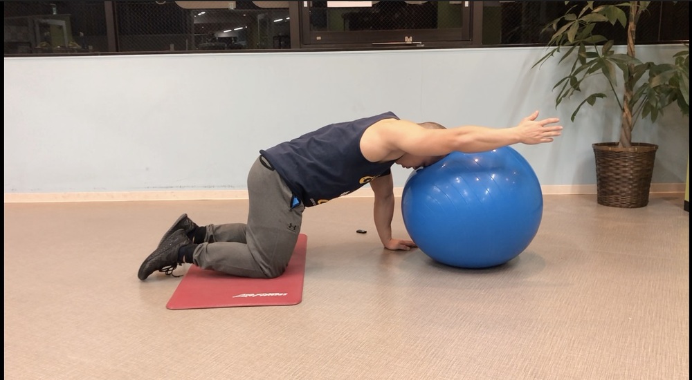 膝をついて座り、画像のようにバランスボールに片腕をおいて、もう一方の腕は肩からまっすぐ下につきましょう。それから、体重を前の方向にのせていき、肩関節その伸ばします。ゆっくり息を吐くのがポイントです。片方ずつ、両腕を行いましょう。