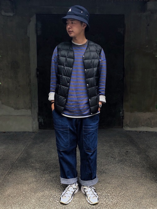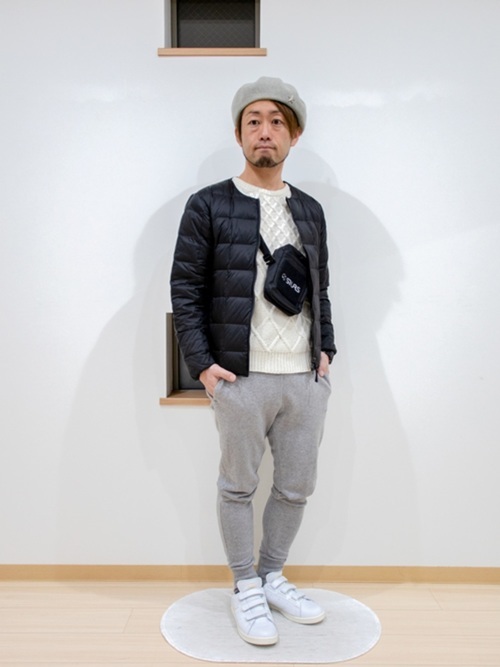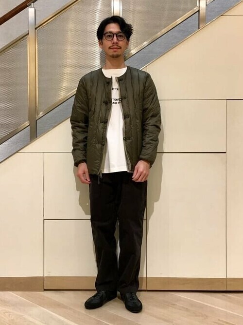 ロンTの上にカーディガン代わりに、クルーネックのブラック系インナーダウンを羽織ったシンプルコーデ。カーディガンよりも男らしい、しかしレザージャケットほど無骨でない、そんなインナーダウンの使い勝手の良さが活きたメンズコーデですね。