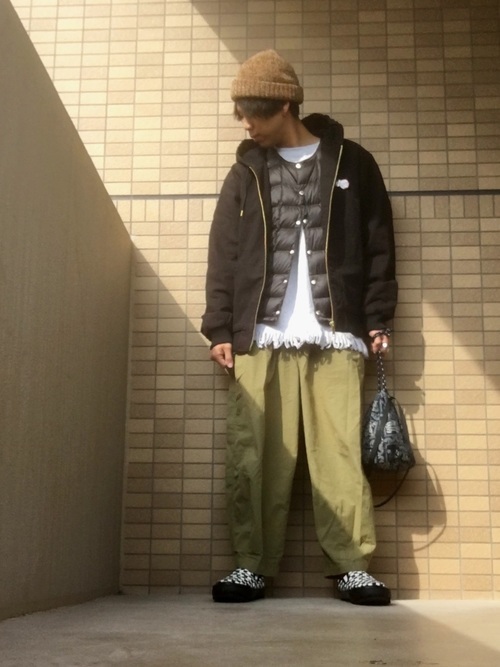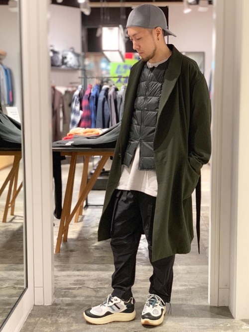 半袖のブラック系インナーダウンを着ることで、他と差別化を図り、かつ機能性も意識したメンズコーデ。パーカーとこちらのワイドパンツではカジュアル過ぎる印象になるので、ブラックの半袖インナーダウンを入れ、動きやすさを残しつつ、大人っぽい印象をプラスしています。