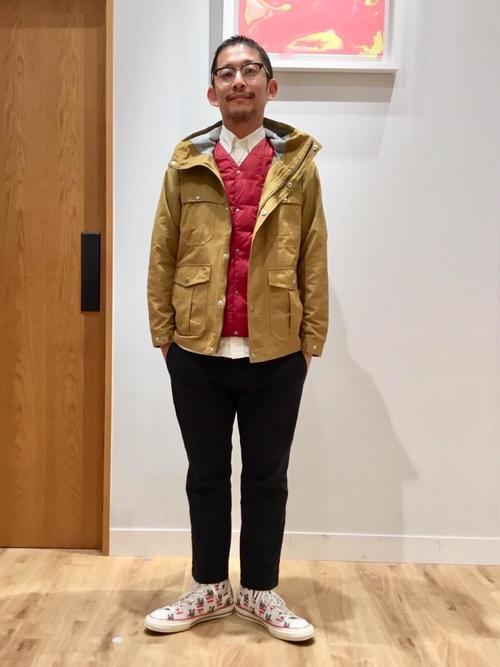 ベージュ系マウンテンパーカーにVネックのレッド系インナーダウンを合わせて、アクセントにしたメンズコーデ。白シャツにマウンテンパーカーという定番の組み合わせに、インナーダウンで差別化を図った着こなしですね。