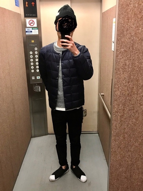 クルーネックのブラック系インナーダウンにグレー系ニットを合わせた、秋におすすめのメンズコーデ。少し寒いけれど本格的なコートやジャケットを着るほどでもない、そんなときはインナーダウンをカーディガンのように着ればばっちりです。