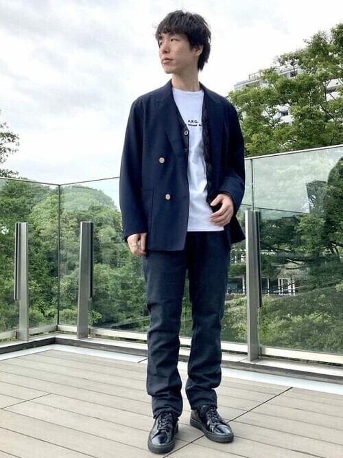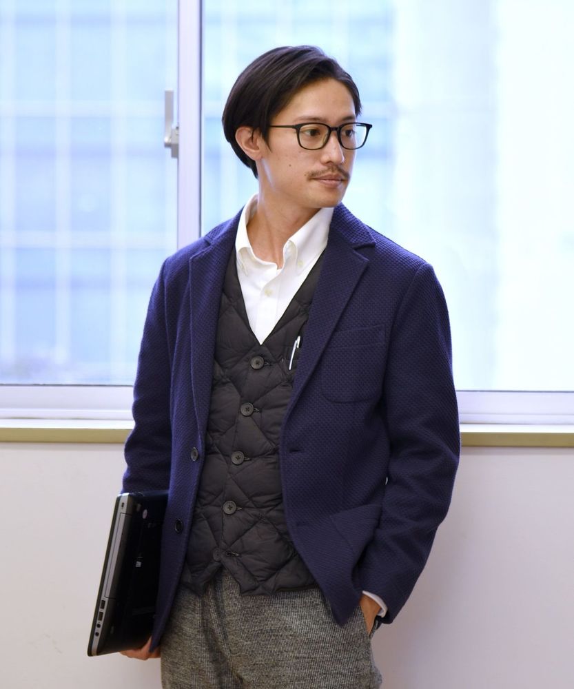 ブルー系ジャケットを使ったシンプルなキレイめスタイルに、ブラック系インナーダウンを差し込んだメンズコーデ。秋口など肌寒いけれどダウンが見えてしまうと暑苦しい印象になる、そんなときはこちらの着こなしのようにジャケットの中にインナーダウンを着て、前を開けておきましょう。そうすることでジャケットスタイルの印象を損いません。