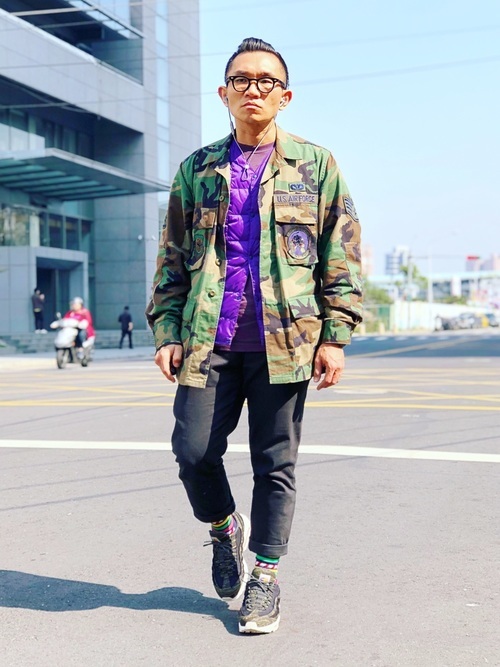 ブラック系の半袖インナーダウンで色のバランスを整えた着こなしです。ベストタイプを使うとレッドが見える範囲が増え、派手な印象になってしまいます。半袖インナーダウンをチョイスすることで赤の範囲を上手に絞っていますね。