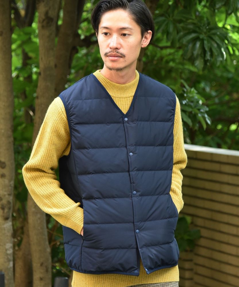 シップス別注、Vネックのベストタイプのインナーダウンです。こちらは通常縫製する部分を圧着処理することで、ダウンが外に出てくることを防いでいます。また、シームレスにすることでよりミニマルな印象に仕上がっています。この大人に合うおしゃれなインナーダウンは、さすがシップス別注と言ったアイテムですね。