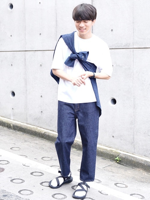 デニムとランニングサンダルを合わせたメンズコーデです。デニムパンツとオーバーサイズの白Tシャツにデニムをたすき掛けして、おしゃれにまとまっています。足元は靴下を合わせたサンダルで抜け感もバッチリです。