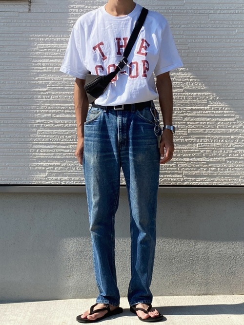 白Tシャツにデニムパンツ、ランニングサンダルを合わせたラフなメンズスタイルです。タックインしたTシャツでキチッとさせながら、裸足のサンダルでカジュアルにまとめています。