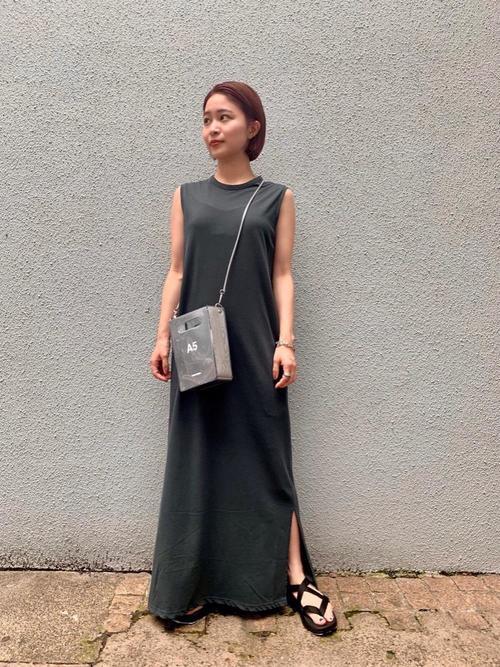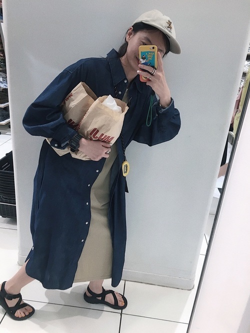 シャツワンピとランニングサンダルのレディースコーデです。丈が足元まであるワンピースとシャツワンピを重ね着して、オーバーシルエットがおしゃれですね。しっかり着込んでいますが、ランニングサンダルで軽やかな印象をプラスしています。