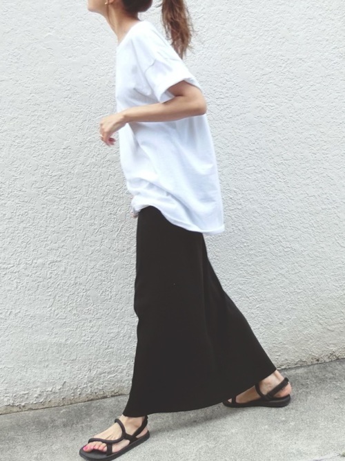 ゆるシルエットがおしゃれなランニングサンダルのレディースコーデです。オーバーサイズの白Tシャツとブラック系のスカートが女性らしいシルエットとカラーのメリハリを効かせています。サンダルの足元がさりげなくカジュアルなスタイルです。