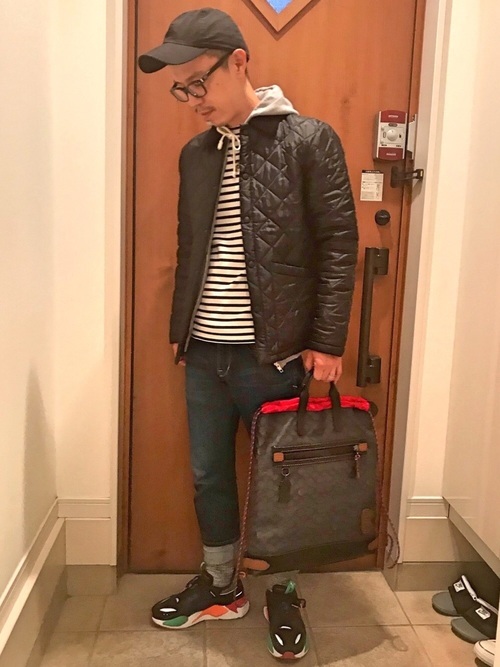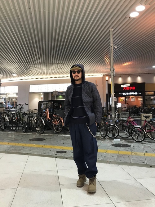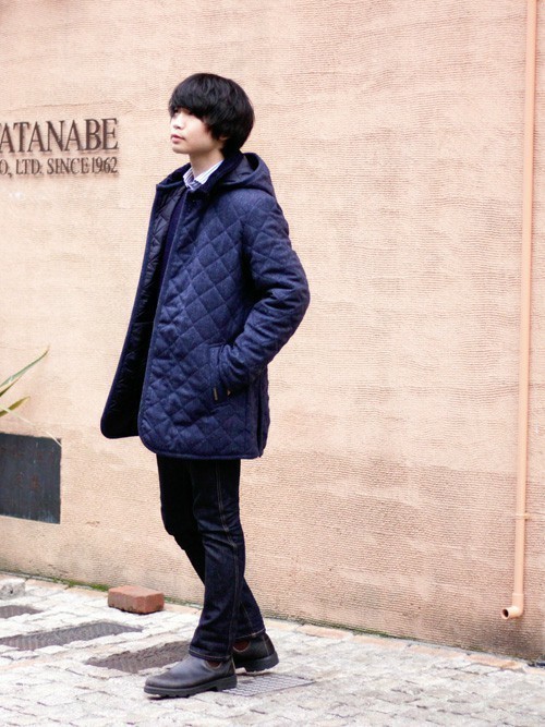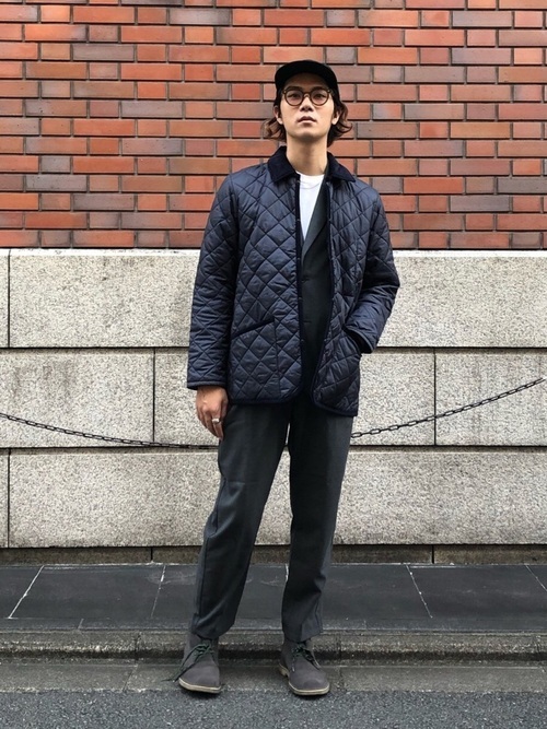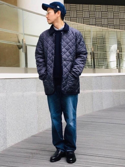 ネイビーのデンストンにワイドデニム、マウンテンブーツを合わせたカジュアルコーデです。ラベンハムのキルティングジャケットにはビジネスや綺麗目の着こなしが多い中、ストリートなコーデにも違和感なく、かつスタイリッシュに馴染んでいます。