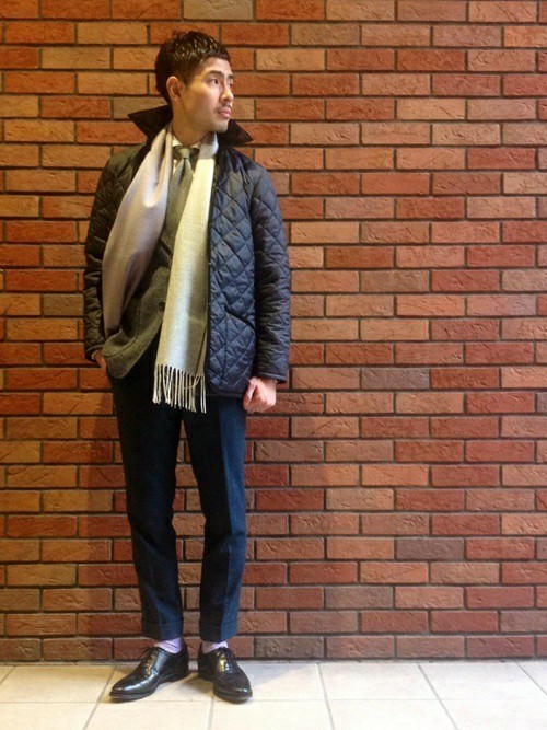 シップスの別注モデル、ケディントンをテーラードジャケットの上から着用したコーデです。少し長めに作られた丈が、ジャケットとのバランスの良さを感じさせる着こなしになっています。キルティング生地でも着膨れせず、上品な大人のメンズコーデを演出していますね。