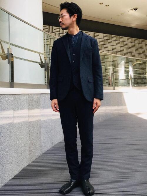 ヘリンボーン生地を使用したデンストン2Sに細身のデニムパンツを合わせたコーデです。ニットセーターの下にはシャツを着用しているので、カジュアルながら好感度の高く、清潔感のある着こなしになっています。