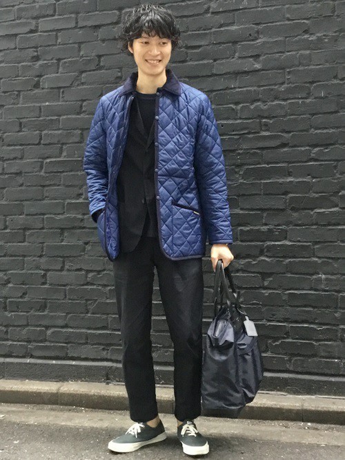 ブルーのケディントンにインナー、セットアップ共に黒いアイテムを合わせたカジュアルコーデです。キルティングジャケットの鮮やかな色が映え、革靴やシャツを合わせればビジネスコーデにも使えそうな清潔感があります。シップス別注モデルは着丈が長いため、コートのように着用できますね。