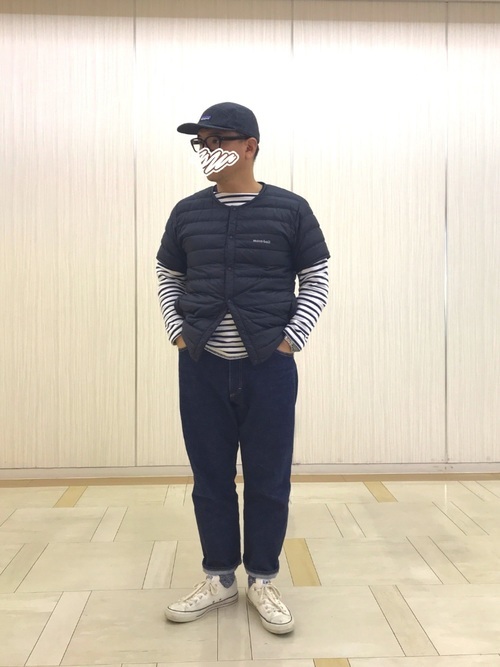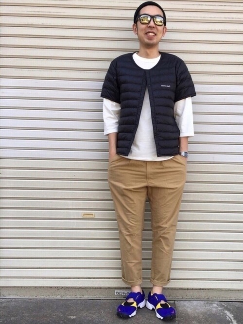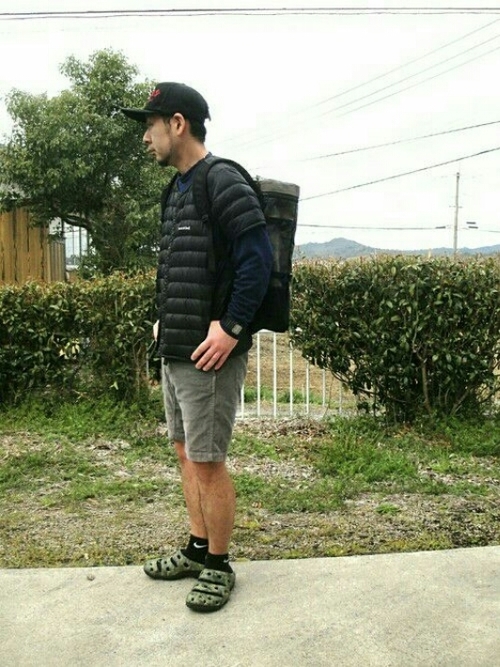 モンベルのインナーダウンは薄手なため、意外とハーフパンツとの相性も良いアイテムです。春のまだ少し肌寒さを感じる時期などは特にオススメの着こなしとなっていますよ。