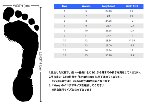 ルナサンダルは日本で生産されておらず、通販や店舗で買えるものは海外からの輸入品となります。そのため、サイズの規格は日本向けではなくアメリカ向けです。画像のような日米対応のサイズ表を確認し、自分の足と近いサイズのルナサンダルを選びましょう。