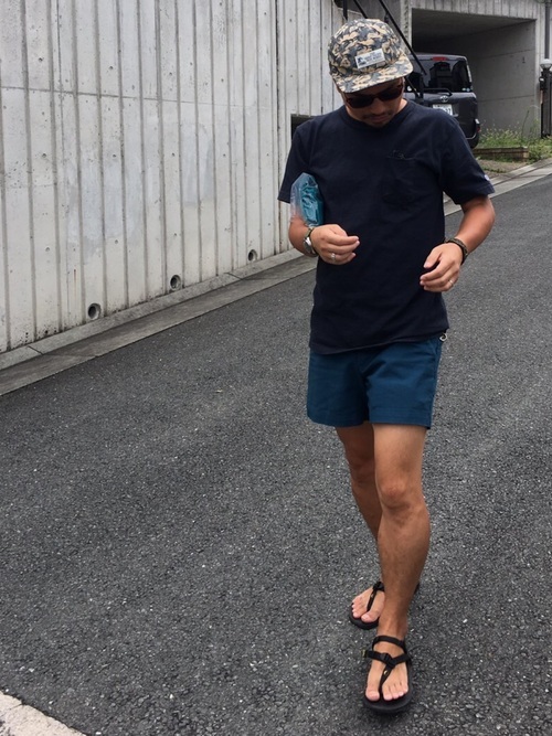 動きやすいカットソーとハーフパンツの簡単なお出掛けスタイルにルナサンダルを合わせたコーデです。ソールの幅が薄いため、OSO FLACOのようなゴツゴツしたモデルでも、武骨感がなく綺麗な履きこなしです。黒のハットで上品な印象をプラスし、カジュアルすぎないこなれたおしゃれ感を出しています。