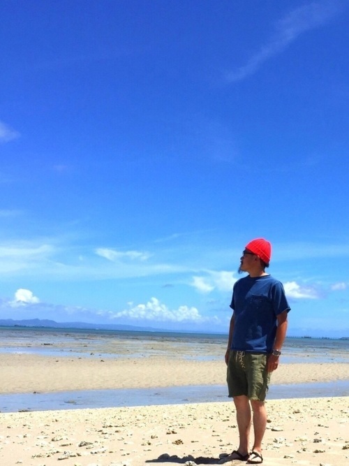 真夏のビーチで楽しむのにぴったりな、ルナサンダルとTシャツ・ハーフパンツのコーデです。重めのブラックですがソールが薄いので、カーキのパンツと合わせても足元が重くならず軽快な装いになります。赤いニットキャップが色合いのアクセントになっています。