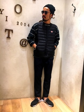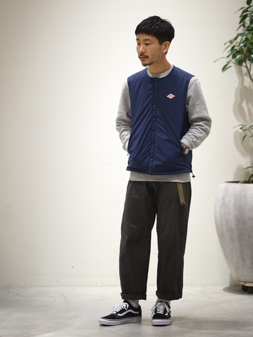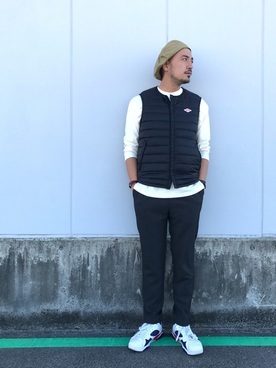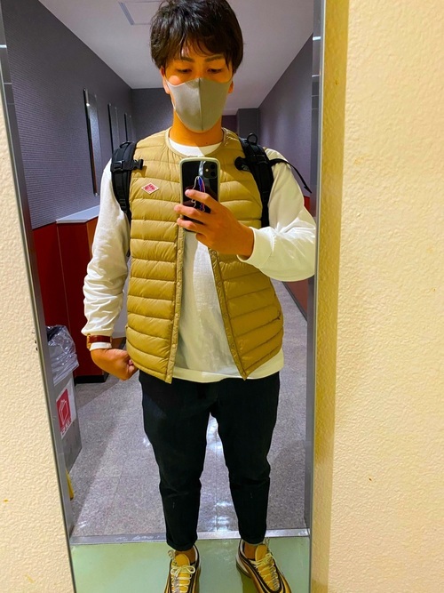 ダントンのインサレーションベストになります。他のインナーダウンと比べてよりスタイリッシュな仕上がりに。すっきりとした印象ですが、防寒性はもちろん抜群でシンプルコーデが好みの方はこちらのインサレーションベストを取り入れるのもいいのではないでしょうか。