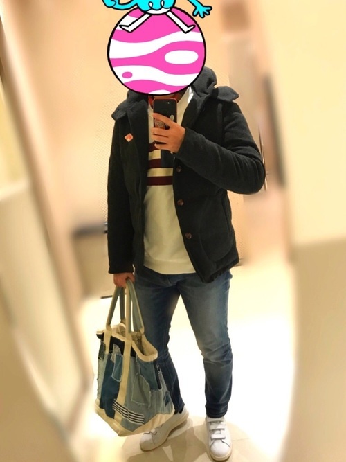 アーバンリサーチとダントンのコラボジャケットを着用したメンズコーデ。全体的にきれいめにコーデされています。白スニーカーがアクセントになったさわやかな着こなしですよね。