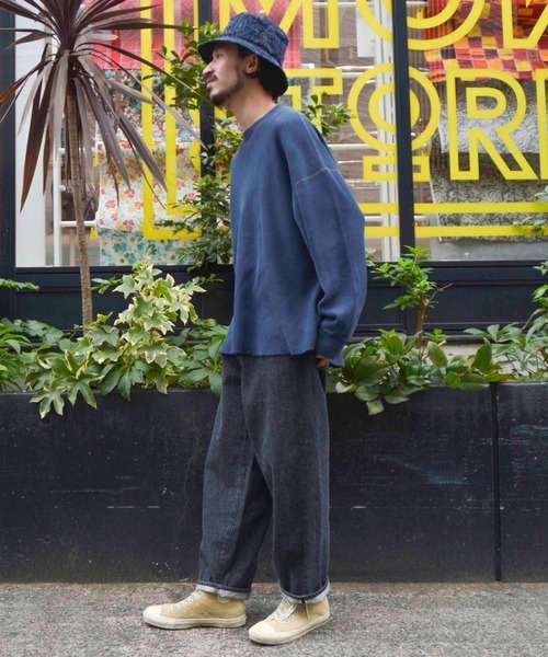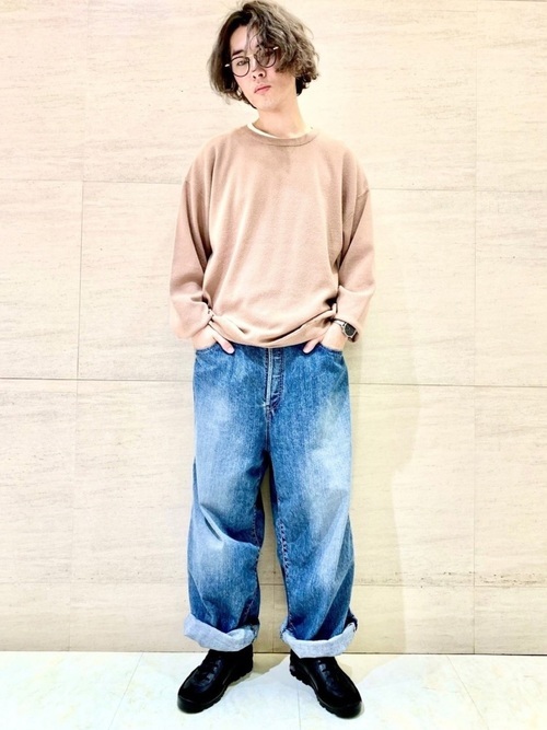 ニットにジョンブルのビッグジーンズを合わせたコーデもなかなか。全体的にゆったりとしたサイズ感のものを合わせてリラックスコーデにしています。