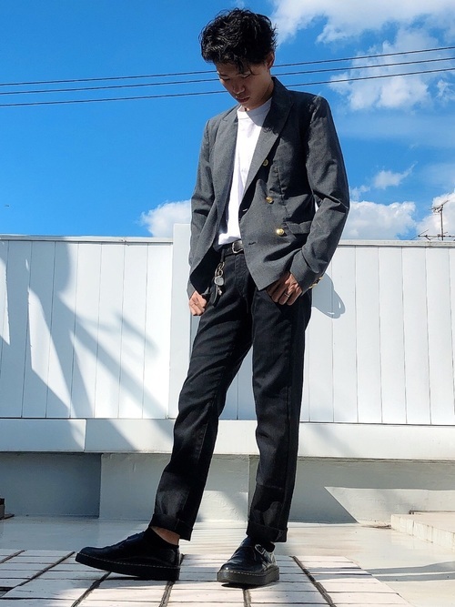 ジョンブルのデニムジーンズに、Tシャツ×ジャケット×シューズを合わせて大人キレイめコーデ。デニムはブラックをチョイスしてスッキリとまとめています。足元は、ショート丈の靴下を合わせ、ボトムスの裾をロールアップして抜け感を強調。シューズもブラックをチョイスして統一感をプラスしています。モノトーンのカラーバランスも絶妙ですね。
