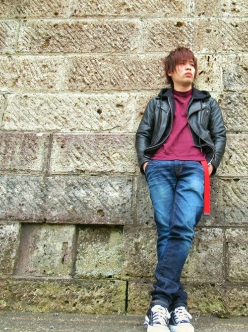 パーカー×ライダースジャケット×ベルト×デニムパンツ×スニーカー