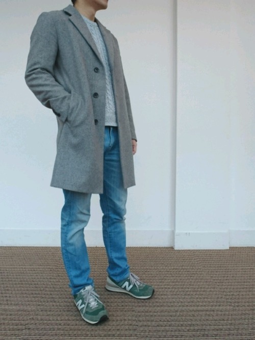チェスターコート×ニットを合わせたコーデにも、ジョンブルのデニムパンツはピッタリ。上半身をグレー系でまとめてシンプルカジュアルなスタイルに仕上げています。ケーブルニットのデザインがちょっとしたアクセントに。足元のスニーカーは、グリーン系をチョイスして差し色を取り入れています。デニムの程良い色落ち感がサマになる大人カジュアルコーデです。