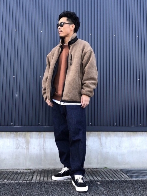 ボアジャケット×スウェット×Tシャツ×スニーカーのコーデに、ジョンブルの濃いインディゴブルーのデニムパンツを取り入れたコーデもグッド。
