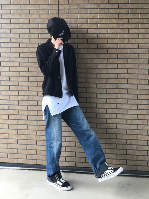 デニムの裾はロールアップしてこなれ感のある着こなしにまとめています。ボトムスにルーズ感があるので、ブラックデニムのジャケットを投入してコーデを引き締め。足元にデザイン性のあるスニーカーを取り入れて、お洒落な印象をプラスしています。全体のバランスが程良くマッチした大人カジュアルコーデです。