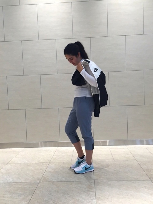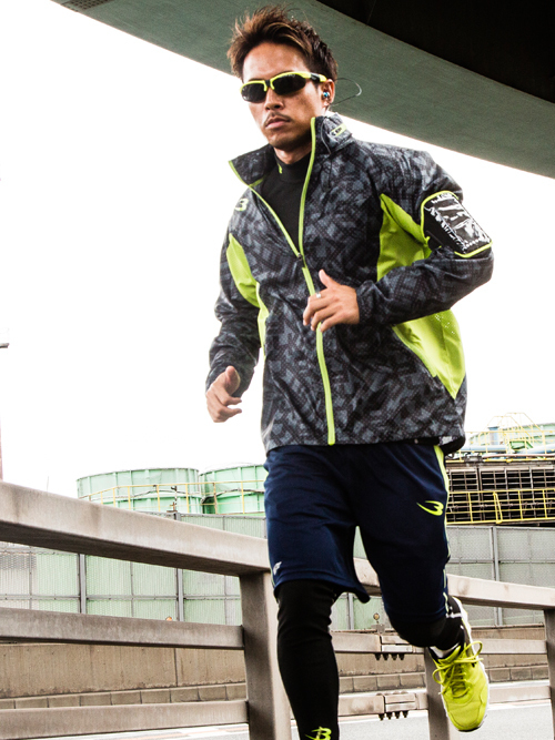 雨が降りそうな天候なら、いつものランニングスタイルにウインドブレーカーを合わせると良いでしょう。写真のコーディネートのように、同じブランドで揃えておくと統一感が出てスッキリまとまります。