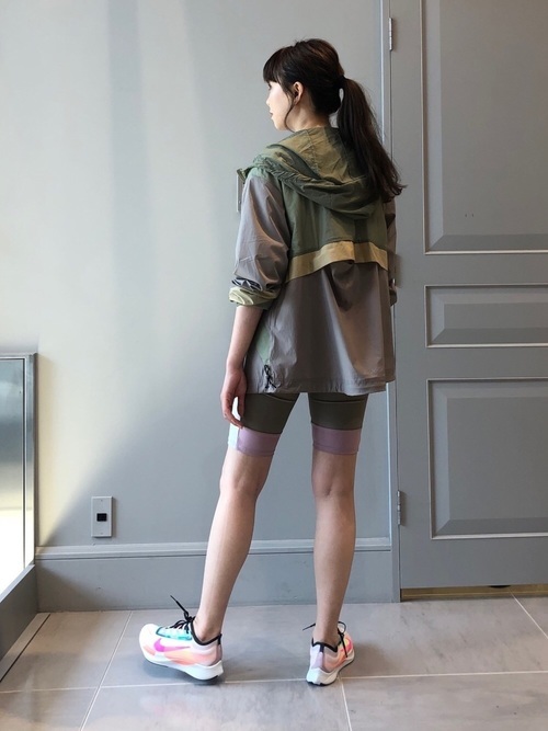 撥水性のあるブルゾンに、ハーフスパッツを合わせたスタイルです。ブルゾンは薄手でやや透け感があり、女性らしい印象にしてくれます。上下をアースカラーでまとめ、足元をレインボーカラーのシューズをチョイスした、雨上がりが待ち遠しくなるコーディネートです。