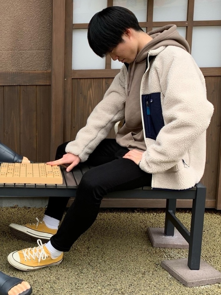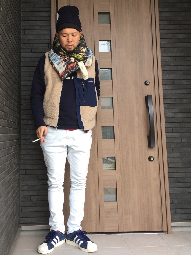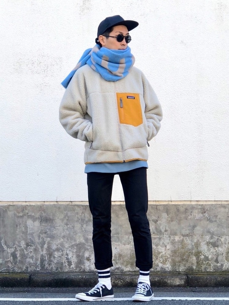 パタゴニアレトロXジャケットにマフラーを合わせ、上半身にボリュームを持たせています。ボトムはブラックのスキニーを組み合わせて、全体のバランスにメリハリを。フリースジャケットからマフラーのカラーに合わせたインナーを覗かせているのもポイントです。