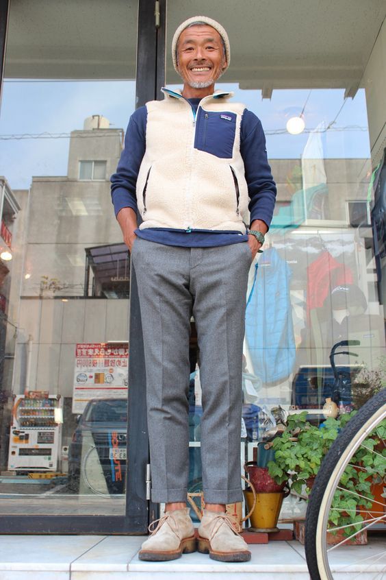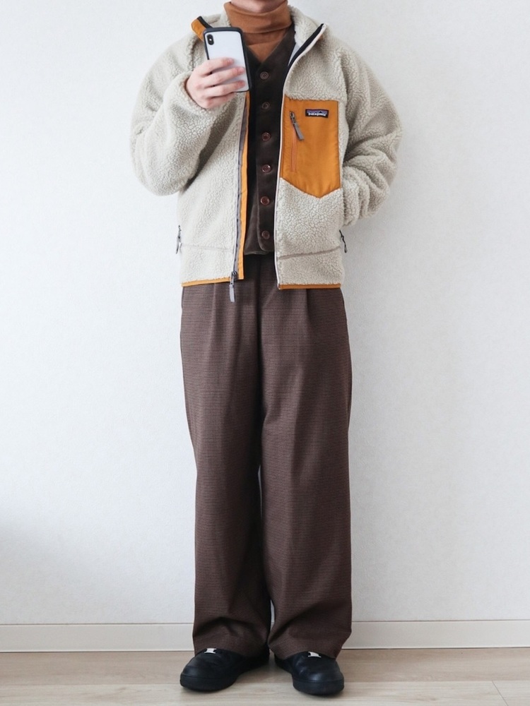 パタゴニアレトロXジャケットとハイネックTシャツを合わせると、どこか上品なメンズコーデになります。こちらはフリースジャケットの胸ポケットのとハイネックTシャツのカラーを合わせており、パンツやインナーのベストもブラウンで統一。技ありな着こなしです。