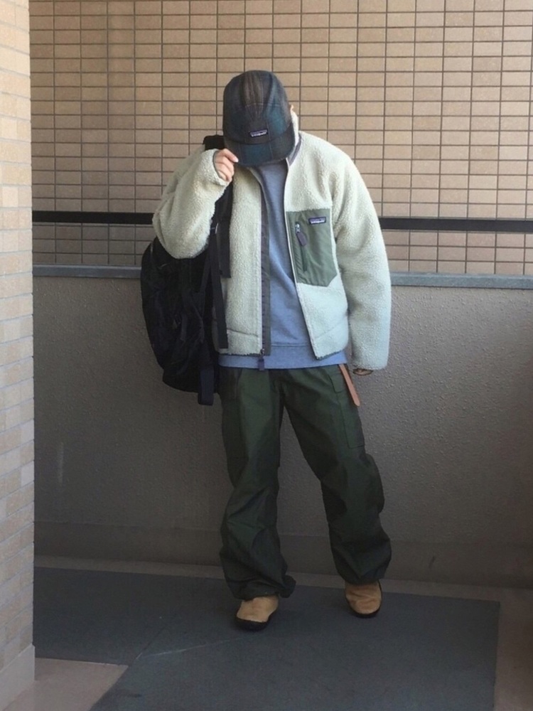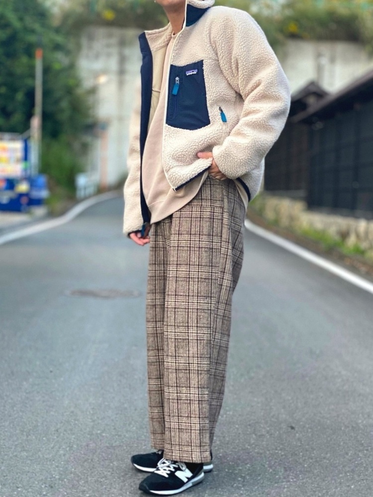パタゴニアのレトロXジャケットにチェックパンツを合わせた秋らしいメンズコーデです。パンツやインナーに着ているトレーナーと、レトロXのジャケットのカラートーンを統一させ、全体的にまとまった印象になっています。