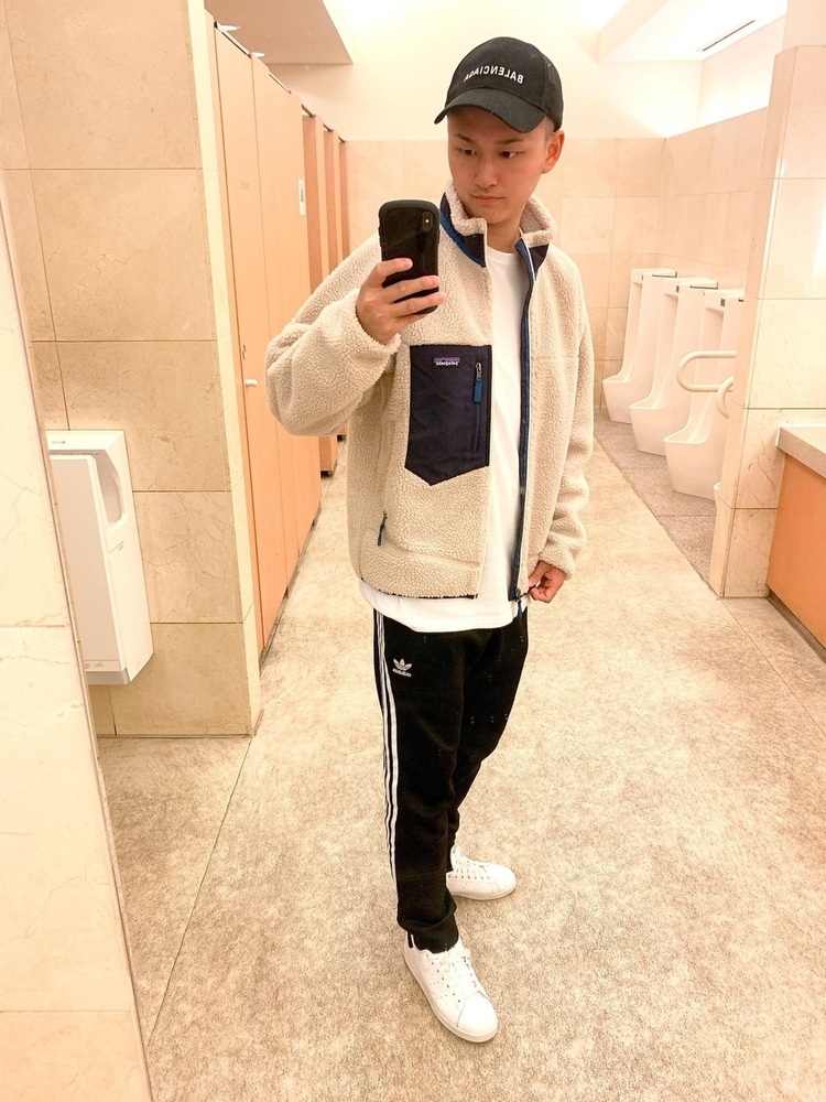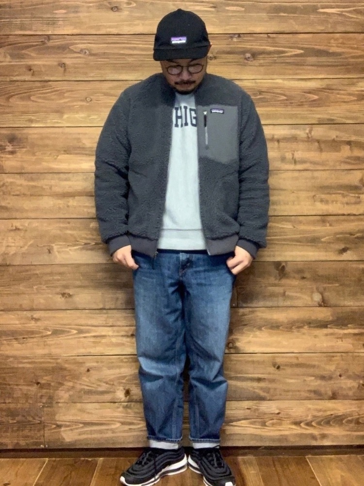 パタゴニアレトロXジャケットにデニムパンツ、キャップを合わせたストリート系のメンズコーデ。足下とキャップのカラーを合わせることで全体的に締まりが出て、ゆったりラインのパンツでもすっきりとした印象になっています。