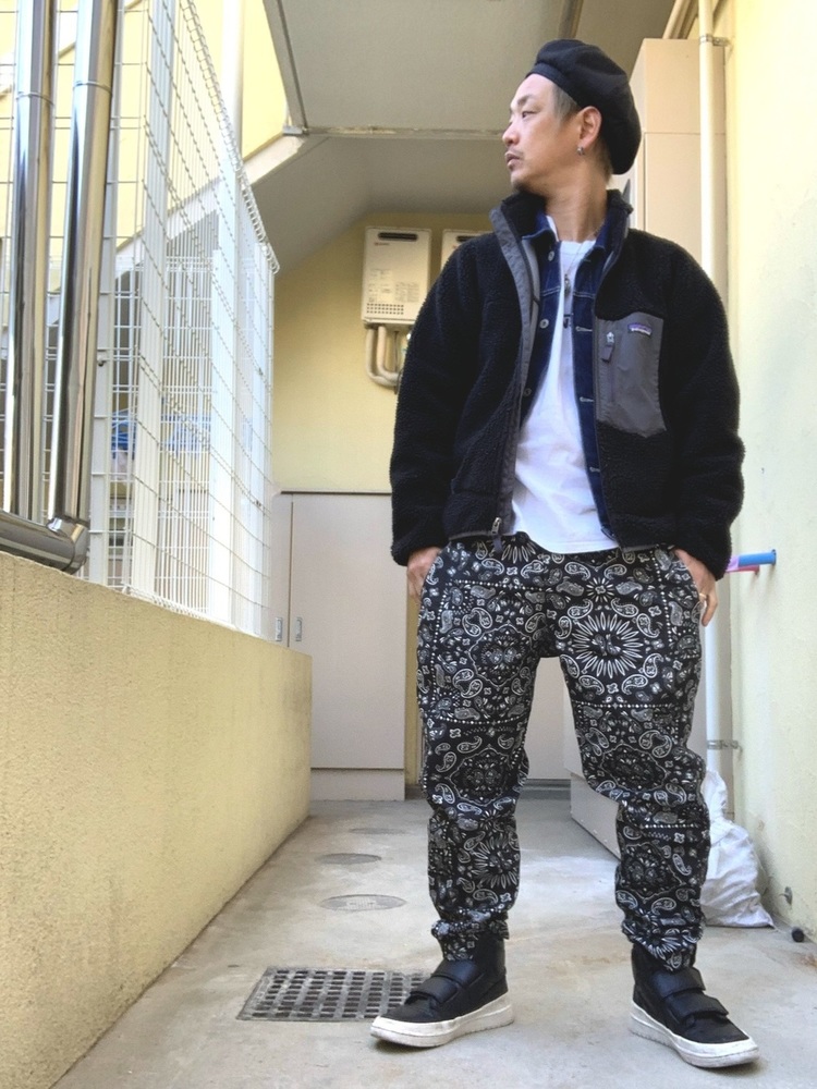 全体のカラーを統一しつつ、ペイズリー柄のパンツで個性を出したメンズコーデです。パタゴニアのレトロXジャケットからインナーに着たデニムシャツを覗かせているのもポイント。ホワイトのTシャツを取り入れることで、暗くなりすぎず、メリハリのある着こなしになっています。