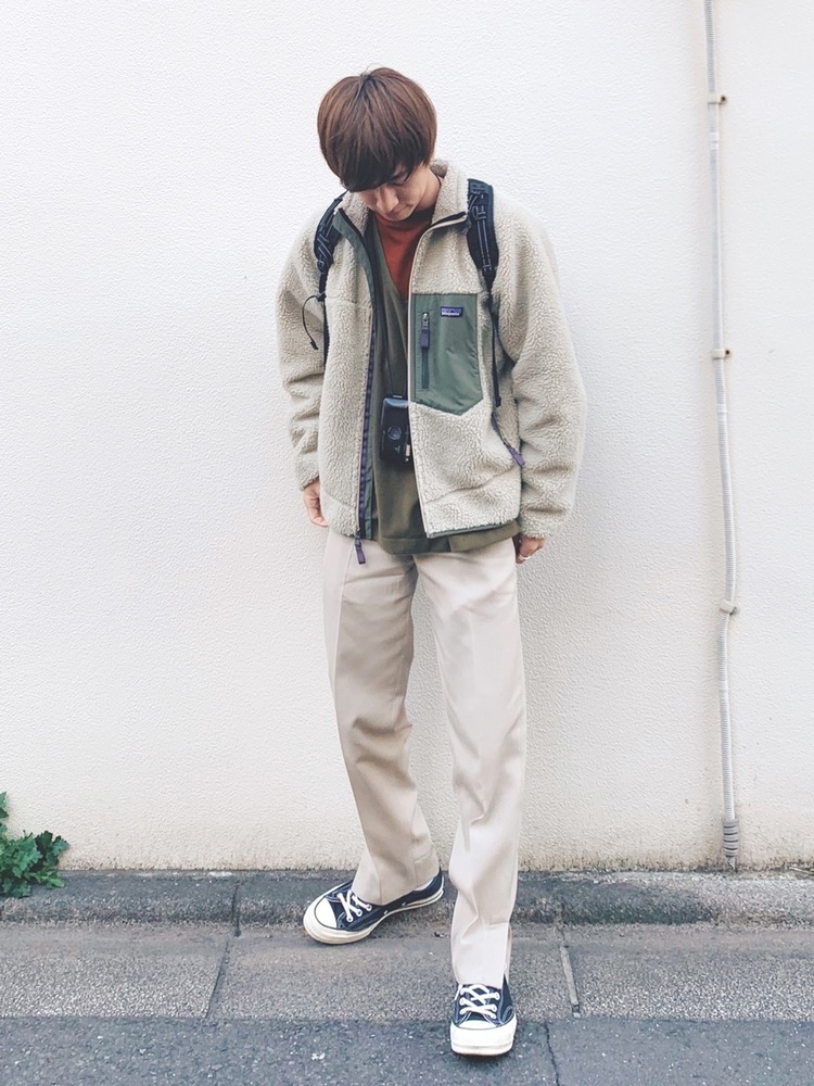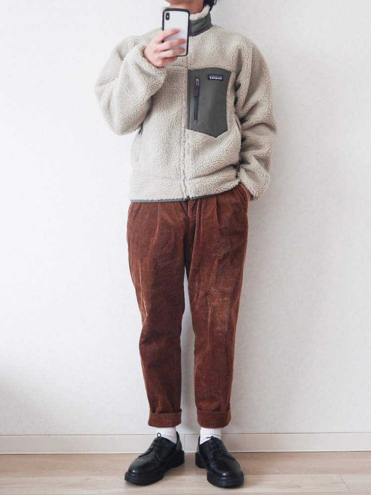 パタゴニアレトロXの胸ポケットや襟元のカラーに合わせて、パンツやソックスを組み合わせた技ありコーデです。フリース素材の温かみとコーデュロイパンツを合わせることで、より秋らしさを感じる着こなしになっています。