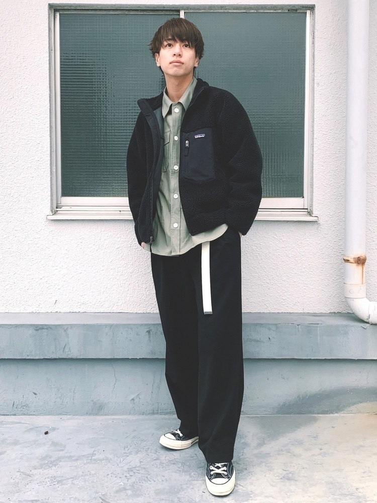 パタゴニアレトロXジャケットとバンツをブラックで統一。インナーに爽やかなグリーンのシャツを取り入れ、重くなりすぎないようバランスをとっています。トレンドのガチャベルトはホワイトをセレクト、コーデのポイントに。