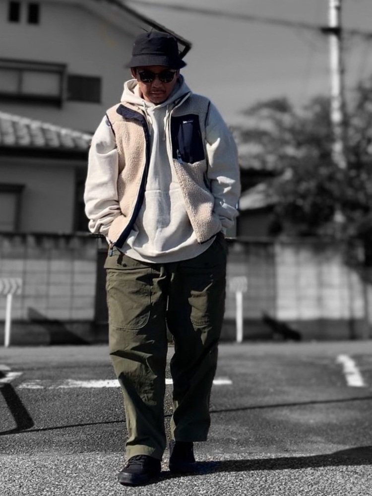 パタゴニアレトロXベストにパーカー、ワイドパンツを合わせたコーデです。全体的にボリュームがありますが、ベストを合わせていることでだらしなくない、まとまった着こなしに。ハットと足下をブラックで締めることで、メリハリがついています。