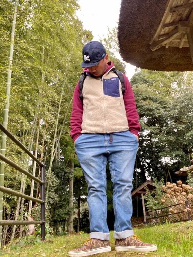 パーカーにフリースベスト、デニムを合わせたカジュアルスタイル。足下のカモフラスニーカーとレトロXベストのカラーがマッチしていて、まとまりのあるコーデになっています。