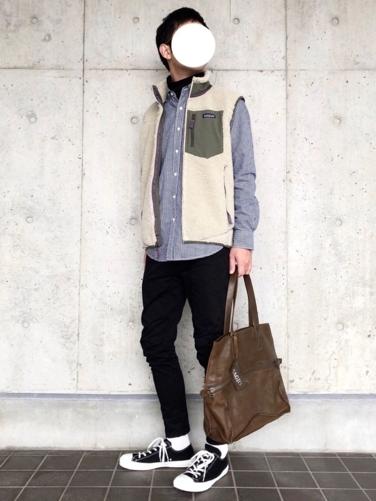 パタゴニアレトロXベストにチェックシャツを合わせたコーデです。ボトムはブラックチノでシンプルに。シャツから覗かせているインナーのハイネックTシャツが、きれいめな印象にしています。