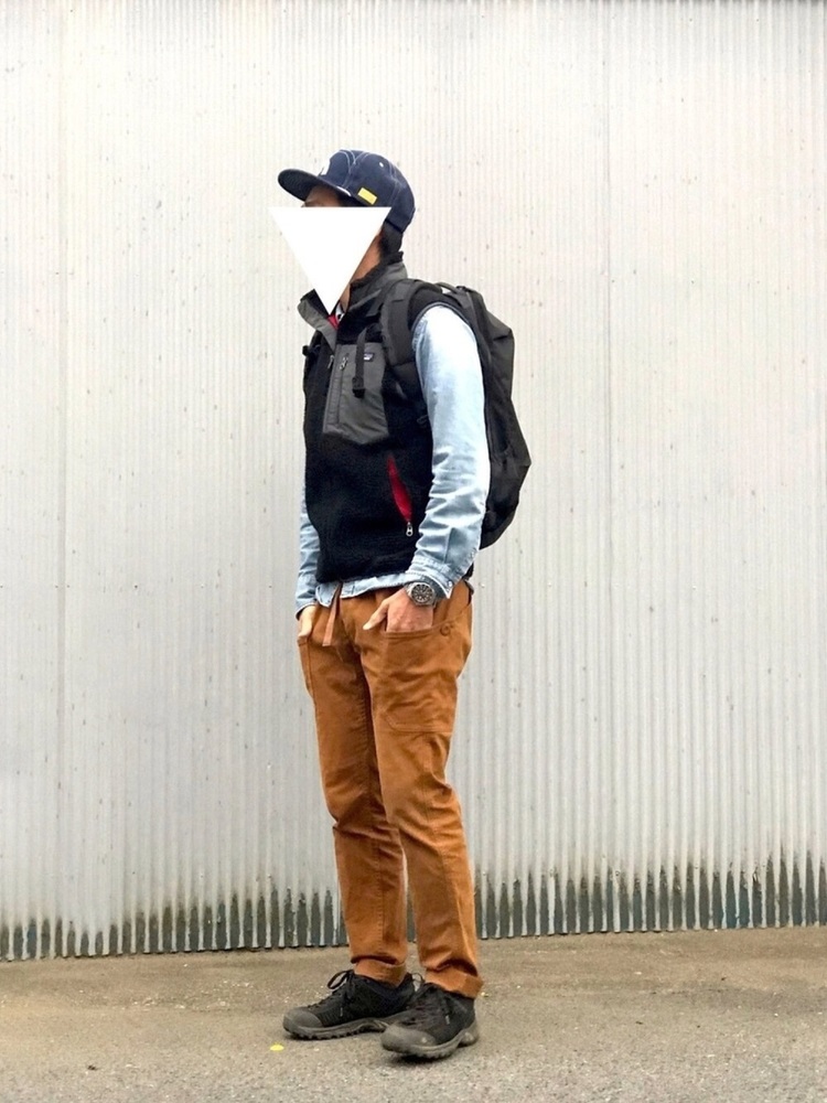 パタゴニアレトロXベストにワークパンツを合わせたアウトドアコーデです。ボトムがゆとりのあるデザインなので、ベストはジップを閉めてすっきりと。ベストの裾から覗くデニムシャツが垢抜けた印象になっています。