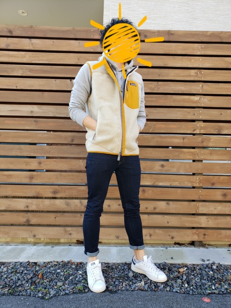 パタゴニアレトロXベストとスキニーのデニムパンツを合わせた、全体的にすっきりとした印象のカジュアルコーデです。アンクルを見せたり、ベストのジップを閉めることでよりまとまった着こなしに。パーカーやデニムなど、全体のカラーがシンプルなので、ベストのイエローがポイントになっています。