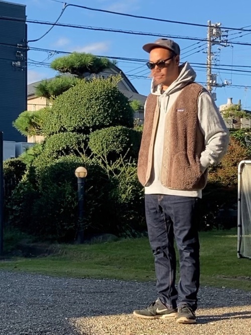 カジュアルな着こなしとグラミチのデニムパンツは相性が抜群。コーデのポイントとしてボアベストを取り入れることで、ワンランク上のコーデになります。大人カジュアルなコーデが楽しめる余裕の感じる着こなしです。